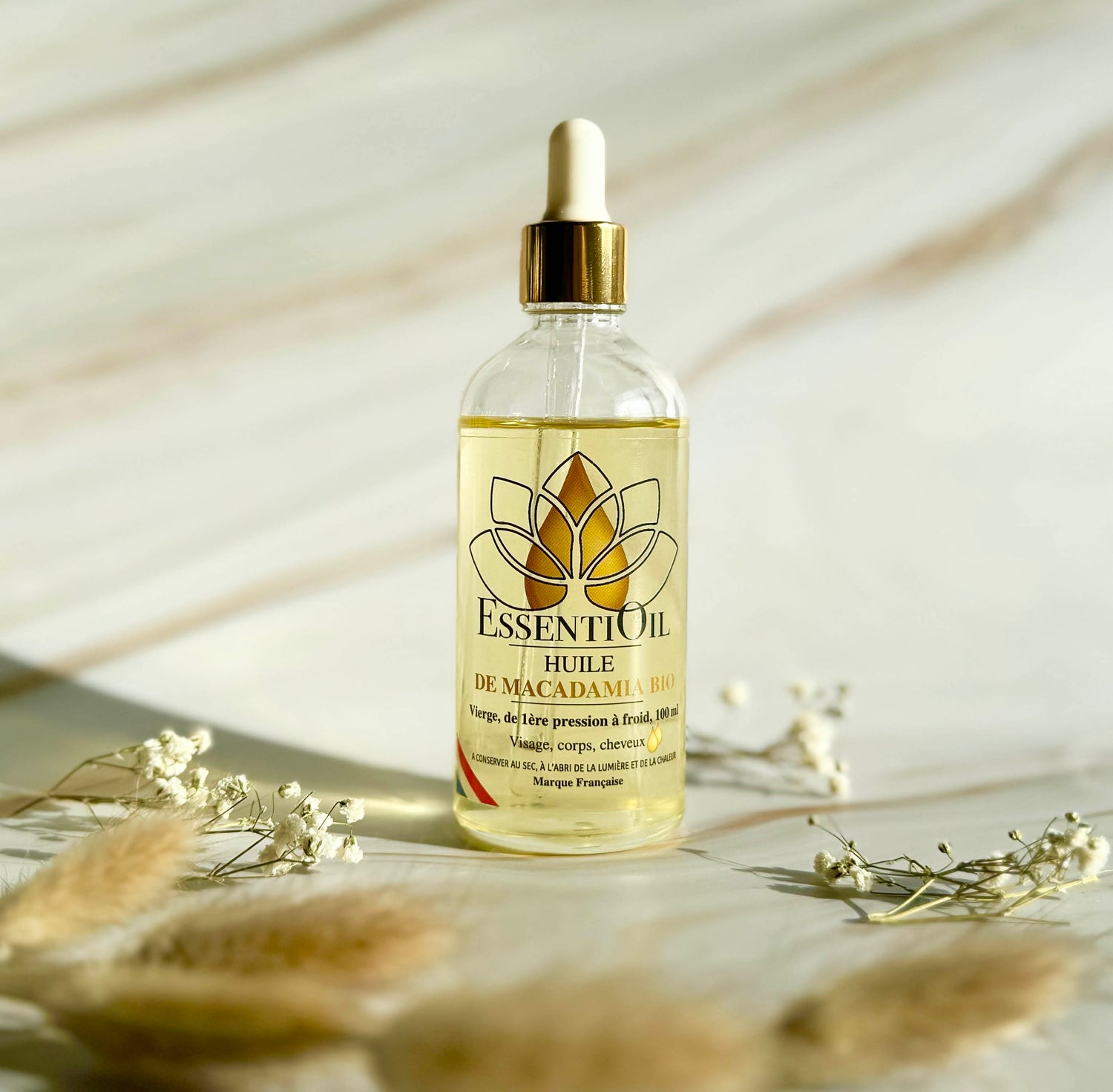 Conservation : Conservez l'huile de macadamia dans un endroit frais, sec et à l'abri de la lumière directe du soleil pour préserver sa qualité.